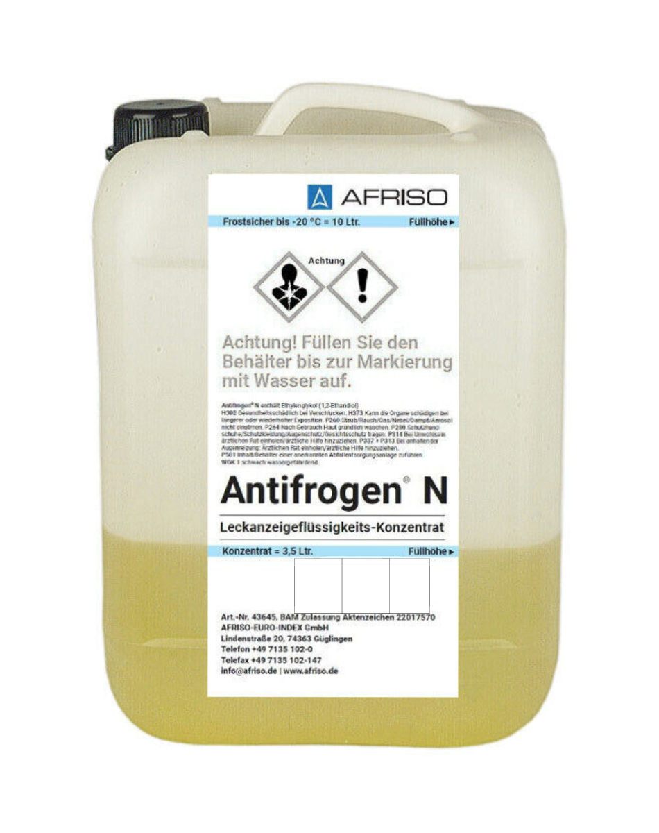 10 Liter Kanister mit 3,5 Liter Antifrogen N. Mischbar mit Wasser auf 8 ℓ bis −30 °C oder auf 10 ℓ bis −25 °C. Größere Gebinde auf Anfrage. BAM-Nr. 1.3/9790-5.1/3436