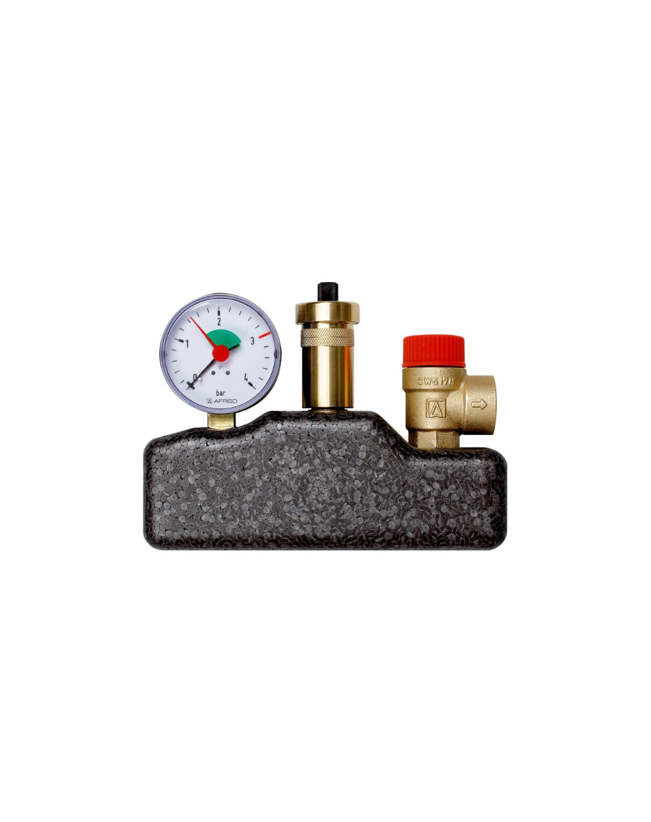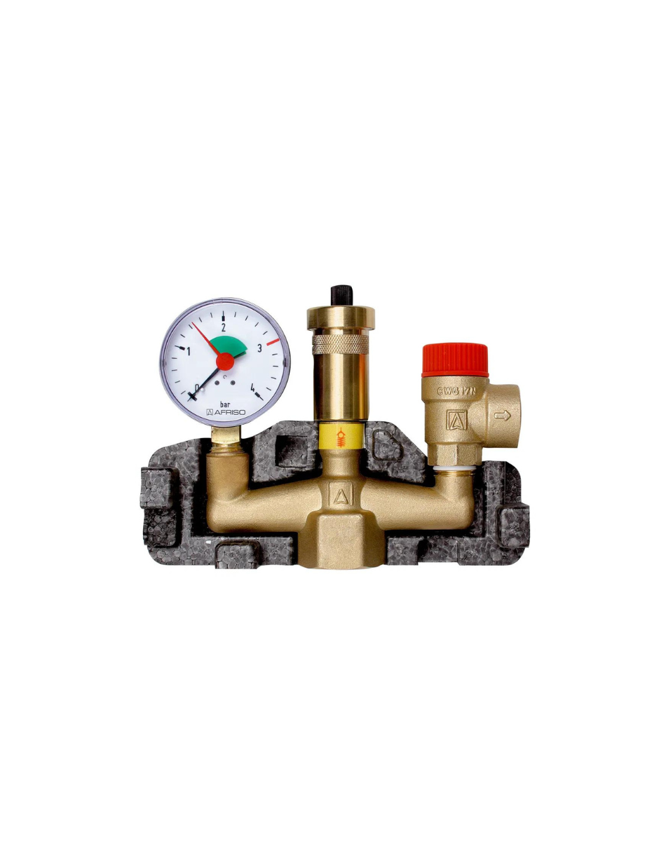 Afriso Kesselsicherheitsgruppe passend für geschlossene Heizungsanlagen nach EN 12828 bis zu einer Leistung von 50 kW. Komplette, fest vormontierte und auf Dichtheit geprüfte Kesselsicherungsgruppe. Bestehend aus Armaturenträger, Heizungsmanometer zur Anzeige des Anlagendruckes, Schnellentlüfter mit Aquastop und Membran-Sicherheitsventil MS in einer formschlüssigen Isolation. Inklusive selbstdichtendem Montageventil für den einfachen Austausch des Schnellentlüfters.