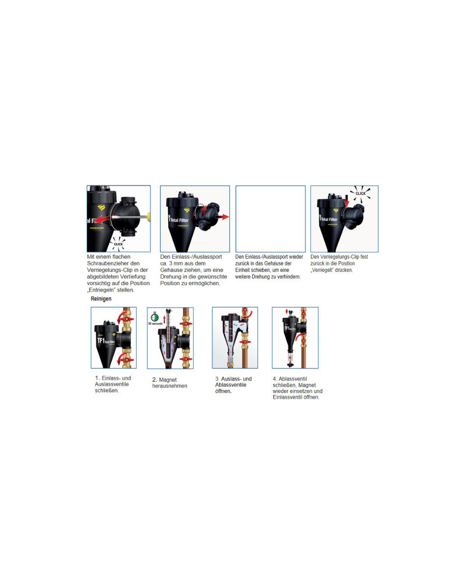 Der Filter TF1 kombiniert Hydrozyklonwirkung mit speziell entwickelten Magnetbaugruppen, um sowohl magnetische als auch nichtmagnetische Verunreinigungen aus dem Heizungswasser zu entfernen und im Filter einzulagern. Der Einbau erfolgt einfach in die Leitung.
