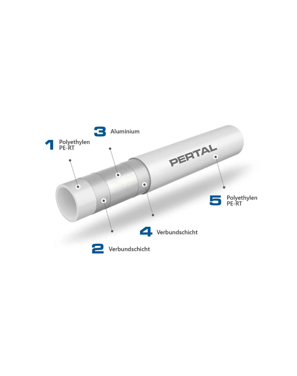 PERTAL Rohre mit Aluminiumschicht ist eine zweite, auf dem Markt weit verbreitete Rohrart für den Bau von Flächenheizungen und kühlungen. Die universellen mehrschichtig aufgebauten PE-Rohre werden mit einer Aluminiumschicht (Anwendungsklasse 1-5 nach ISO 10508) hergestellt.