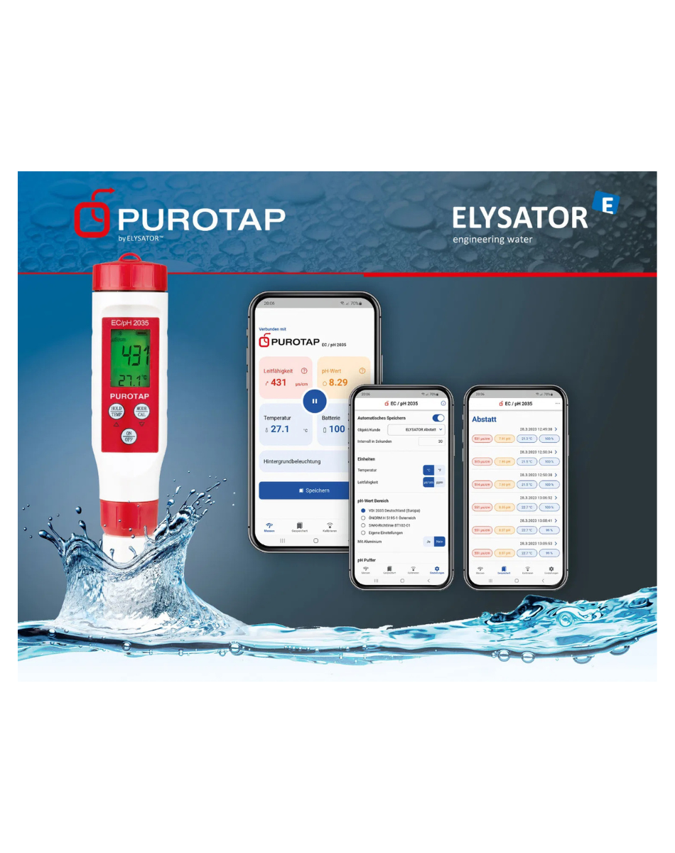 Kombi-Messgerät all-in-one für professionelle Messungen von pH-Wert, Leitfähigkeit, TDS und Temperatur in Anlehnung an die VDI 2035; ÖNORM H 5195-1; SWKI BT-102-1. Mit LCD Display und Datenverwaltung über die kostenlose Smart-APP von Elysator.