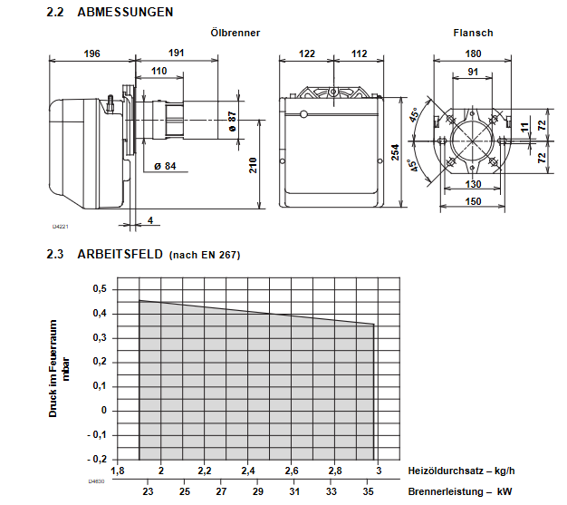 | Durchsatz - Brennerleistung | 1,90 / 2,95 kg/h – 22,5 / 35,3 kW |