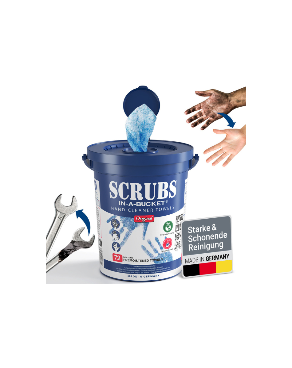 SCRUBS in a Bucket sind leistungsstarke, vorgetränkte Reinigungstücher für die gründliche und schonende Entfernung selbst hartnäckigster Verschmutzungen – ganz ohne Wasser. Ideal für unterwegs, auf der Baustelle, in der Werkstatt oder im Servicefahrzeug.
